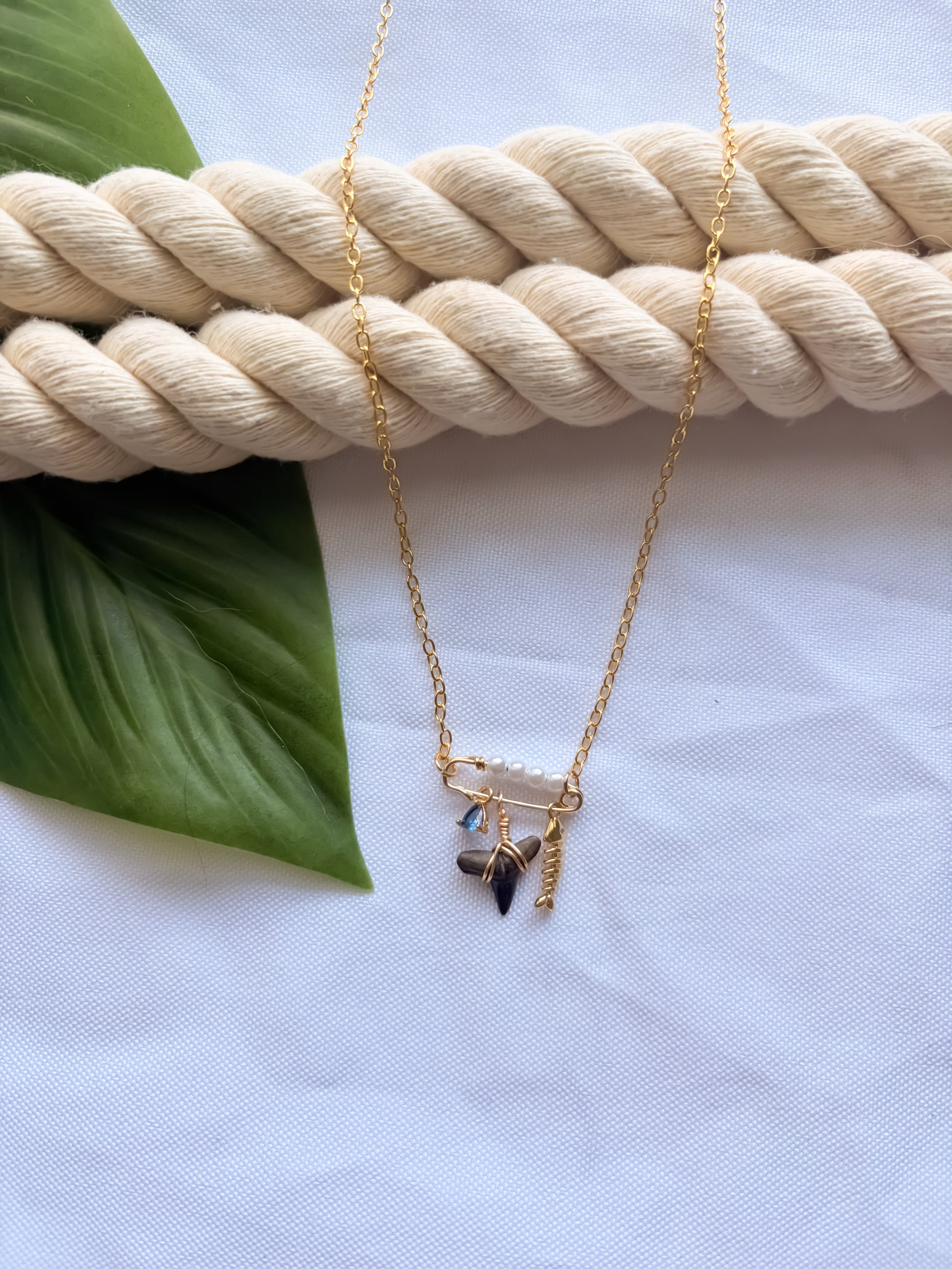 - Charms: Shark tooth, fish bone, pearl, blue gemstone bead