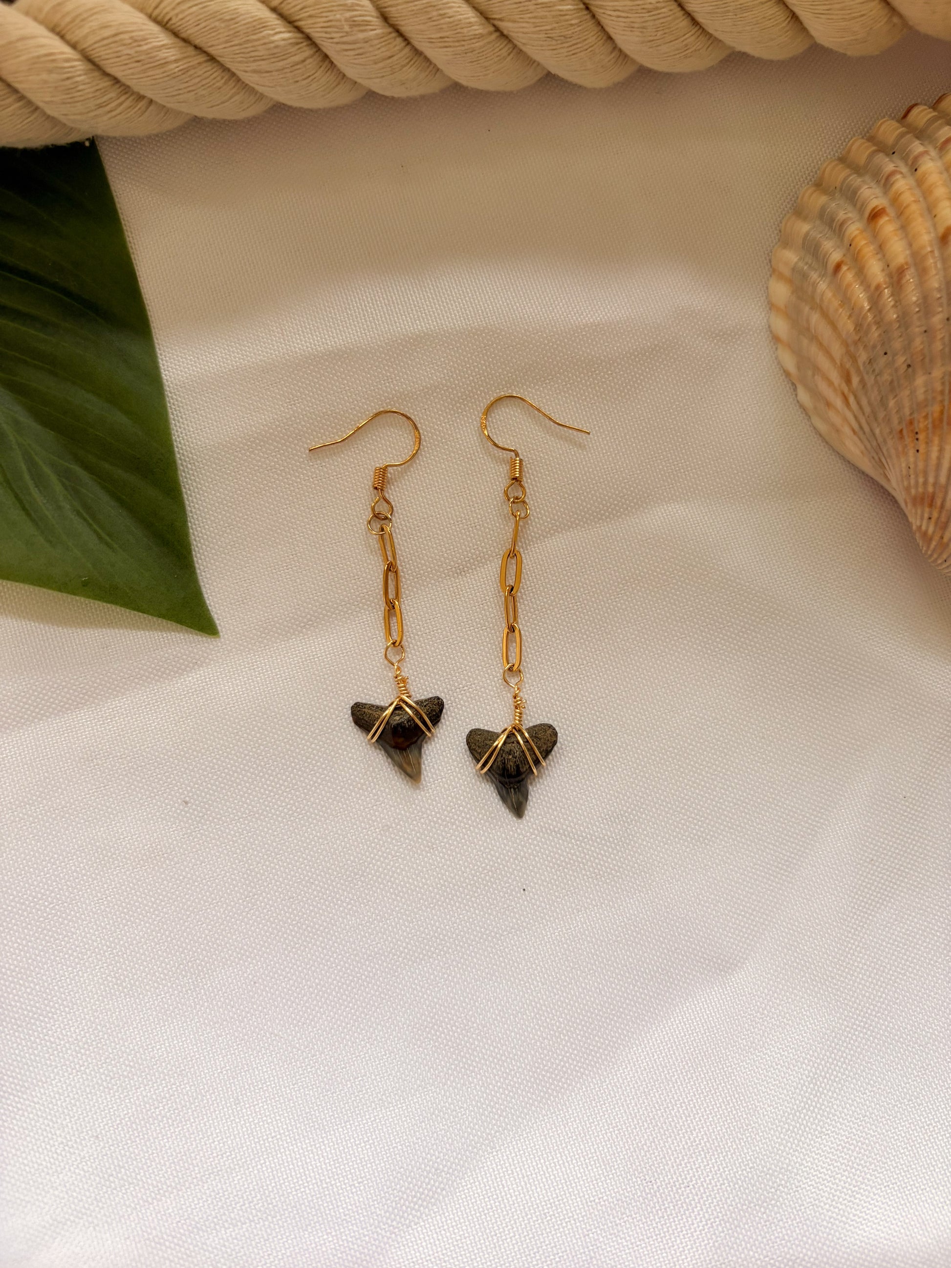 fossilized shark teeth suspended from delicate paperclip chain drops. Crafted with 18k gold filled materials that are fully waterproof, lightweight, and made for every wave, tide, and sunset.