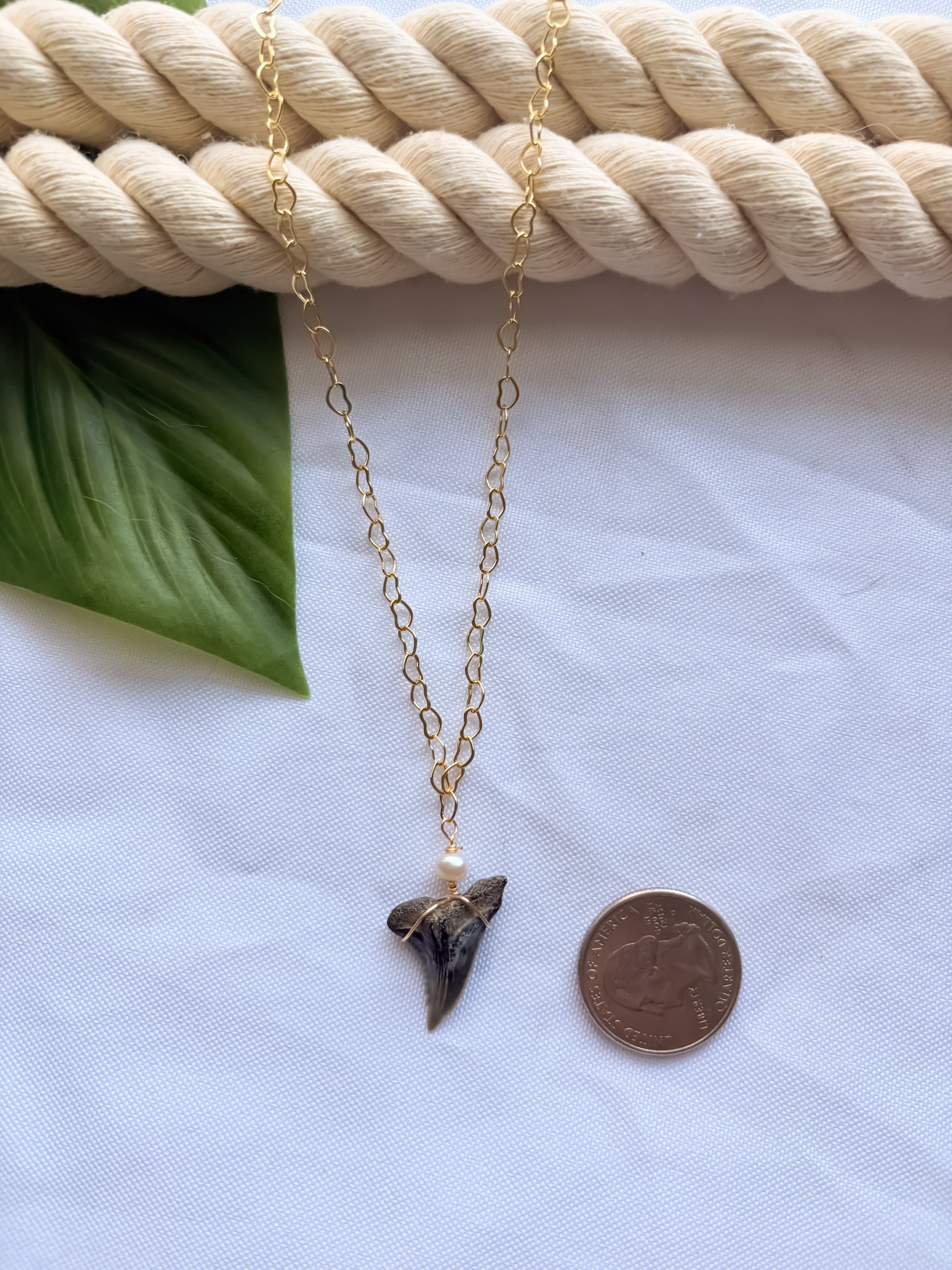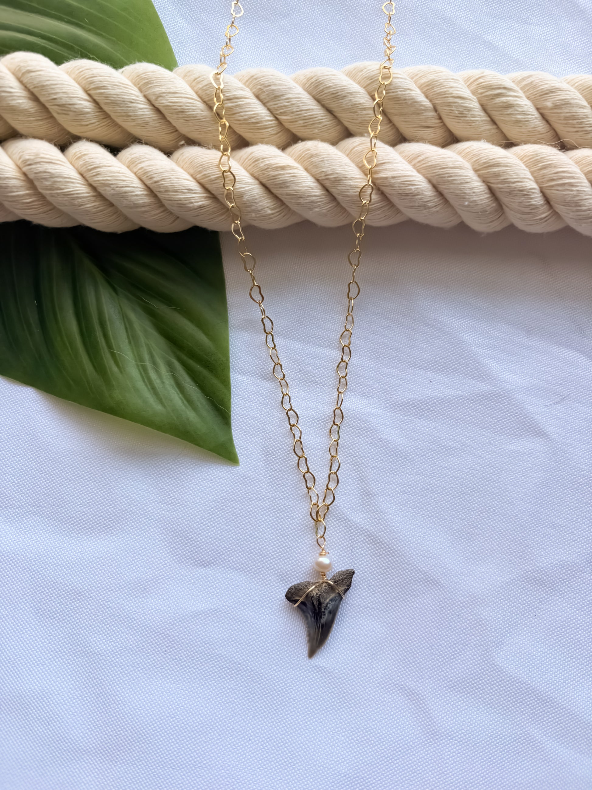 Gold Filled heart-link chain necklace featuring an ethically sourced shark tooth crowned with a genuine freshwater pearl, echoing feminine ocean luxury with coastal charm.
