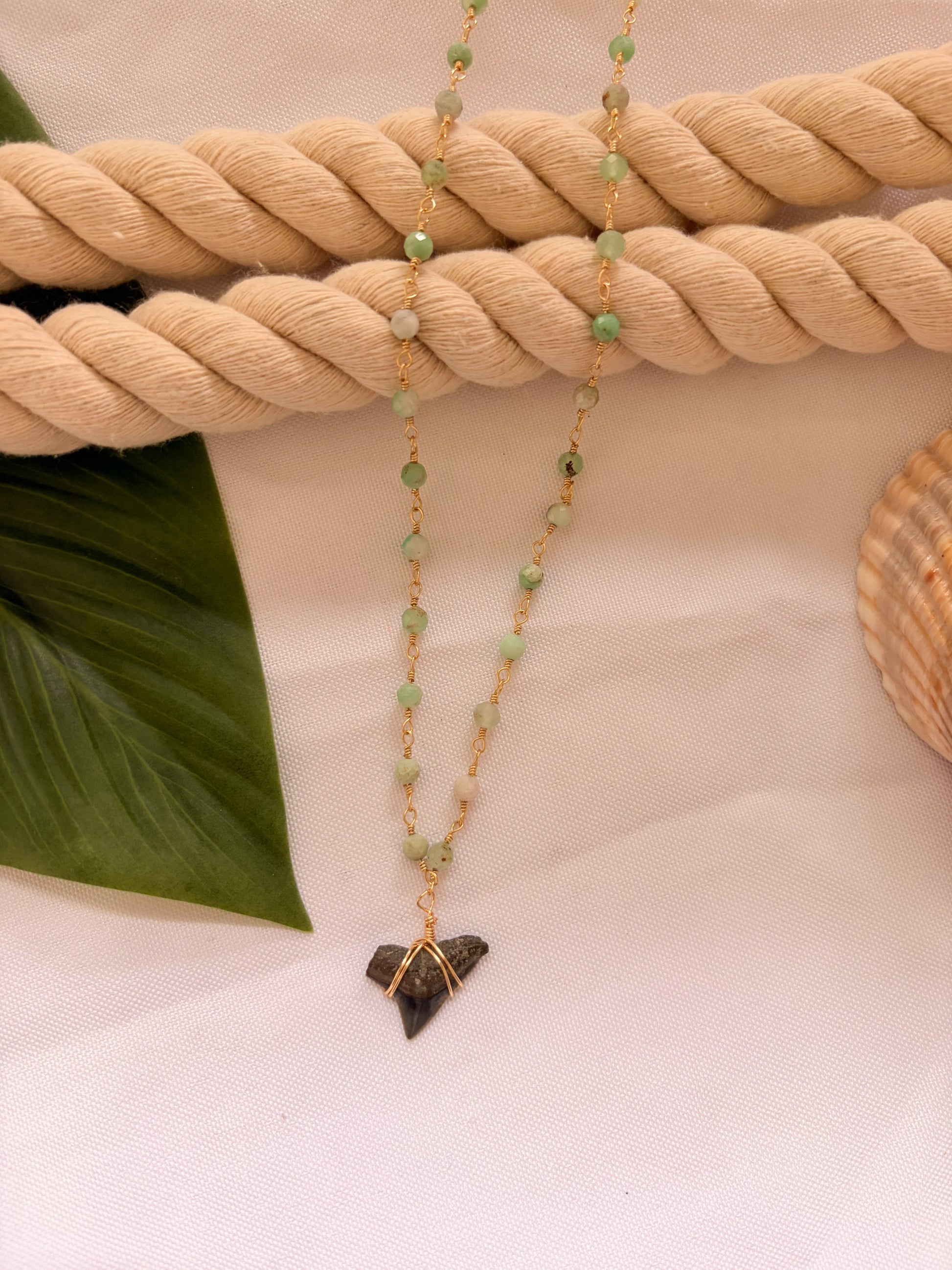 š Details: 18k gold filled, waterproof, chrysoprase gemstone beaded chain, genuine fossil shark tooth