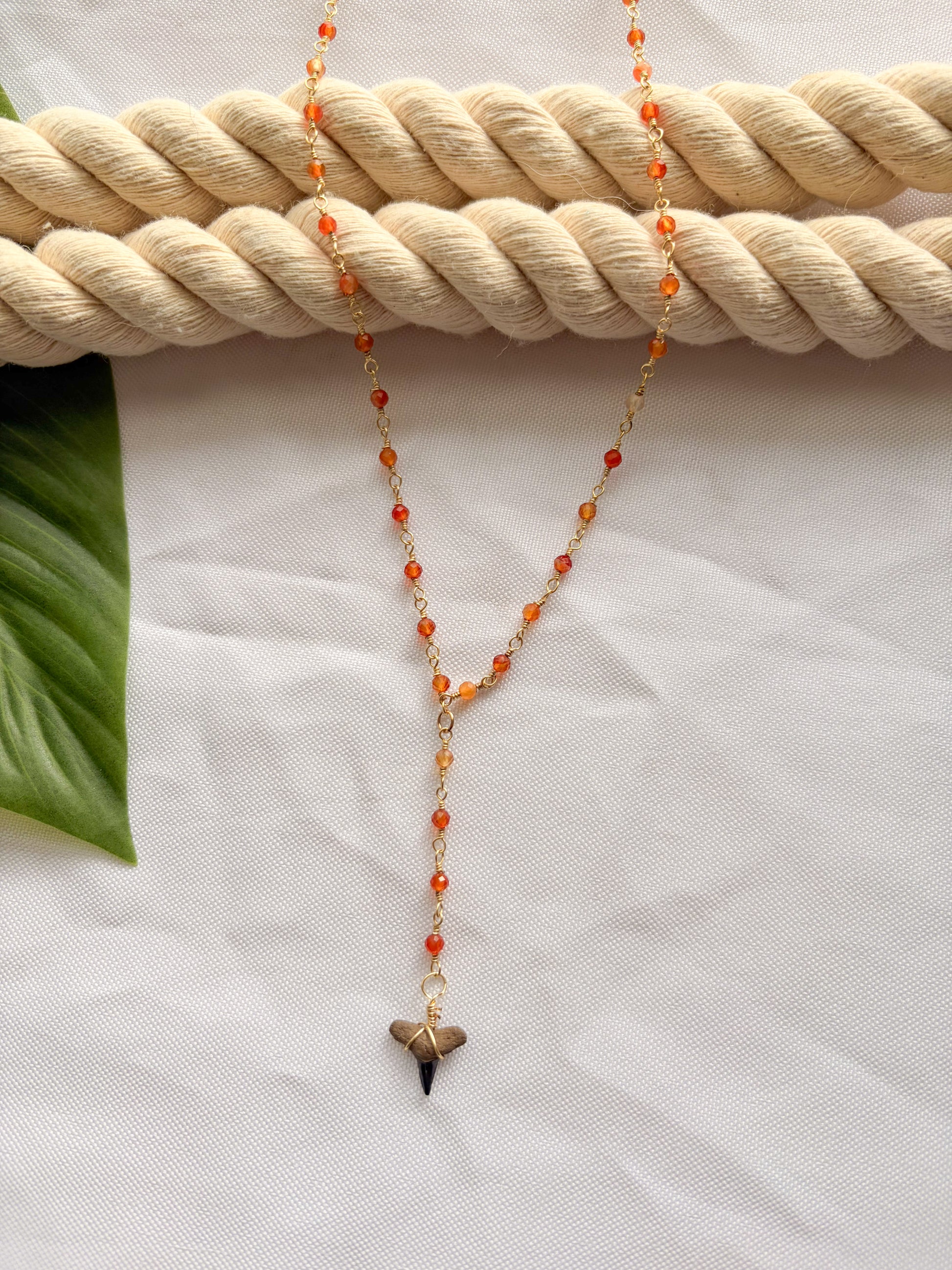 This warm-toned lariat features vibrant orange beads and a hand-wrapped shark tooth drop. A glowing sunset-inspired piece that adds the perfect pop of color.