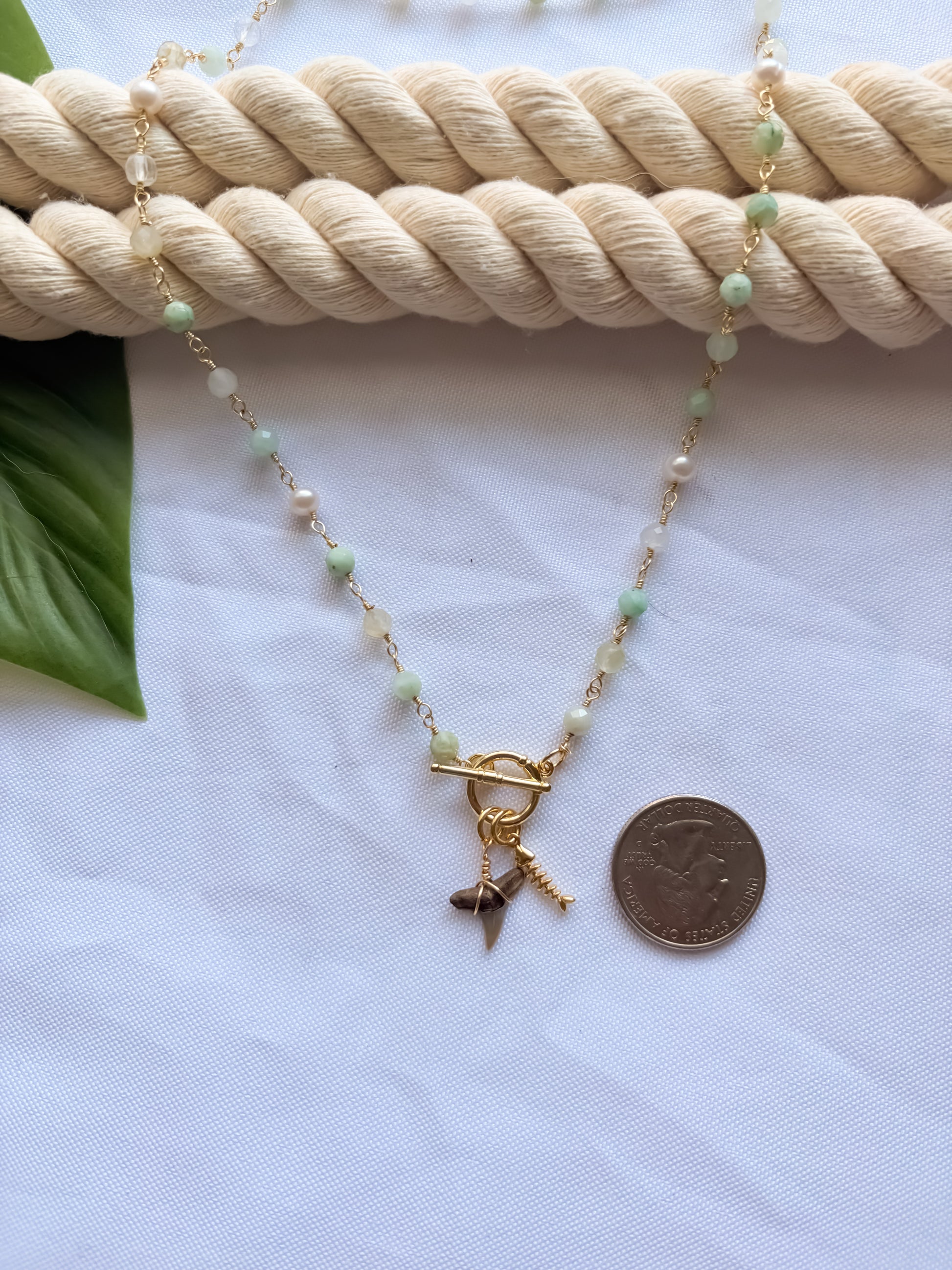 Ethically sourced shark tooth wrapped in 18k gold-filled wire on a waterproof chrysoprase and freshwater pearl chain. Toggle clasp closure with fish bone accent. Gentle green tones designed for sunshine and sea spray days.