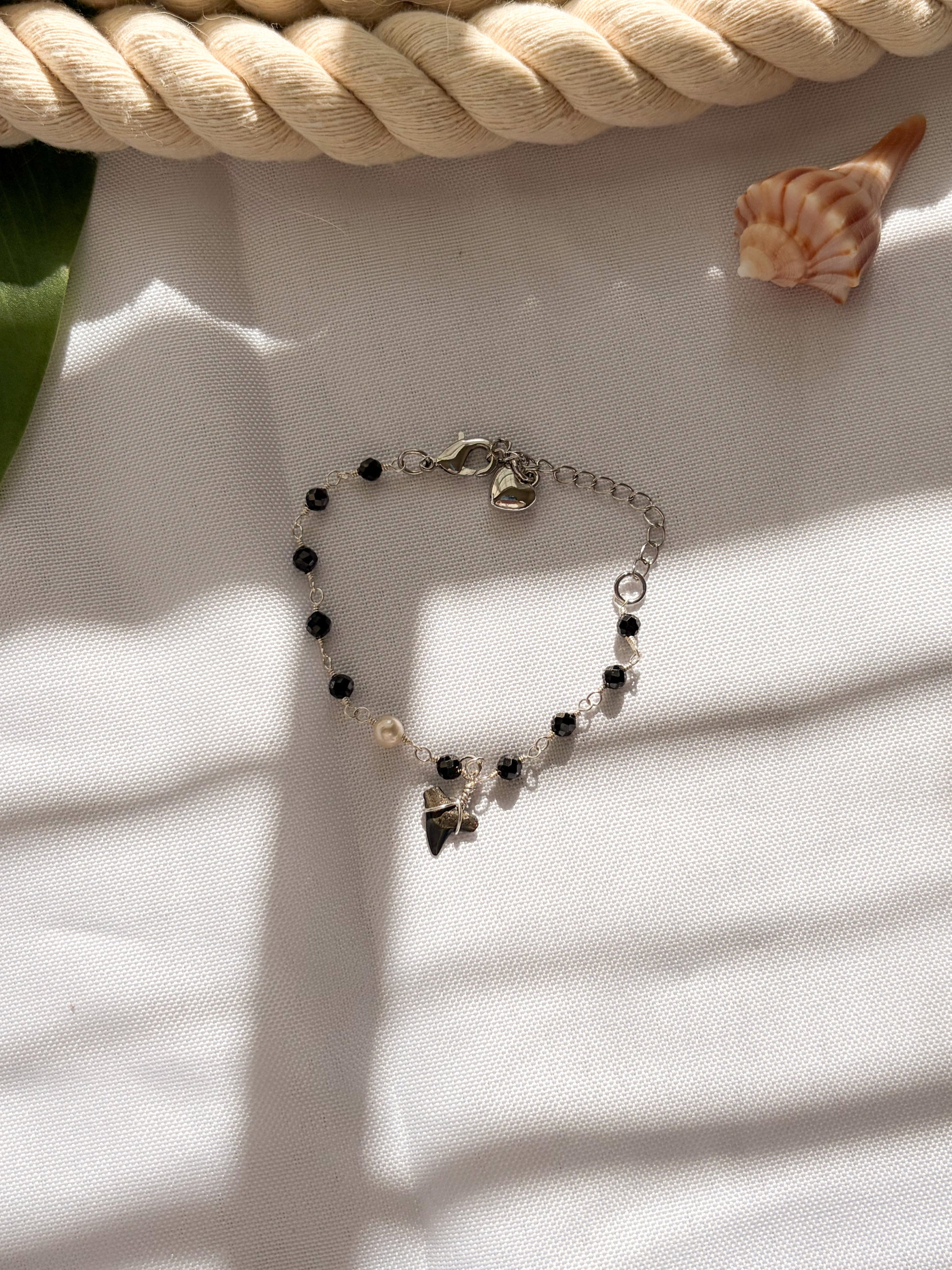 Ethically sourced shark tooth wrapped in waterproof sterling silver on a black faceted beaded chain with a freshwater pearl accent.