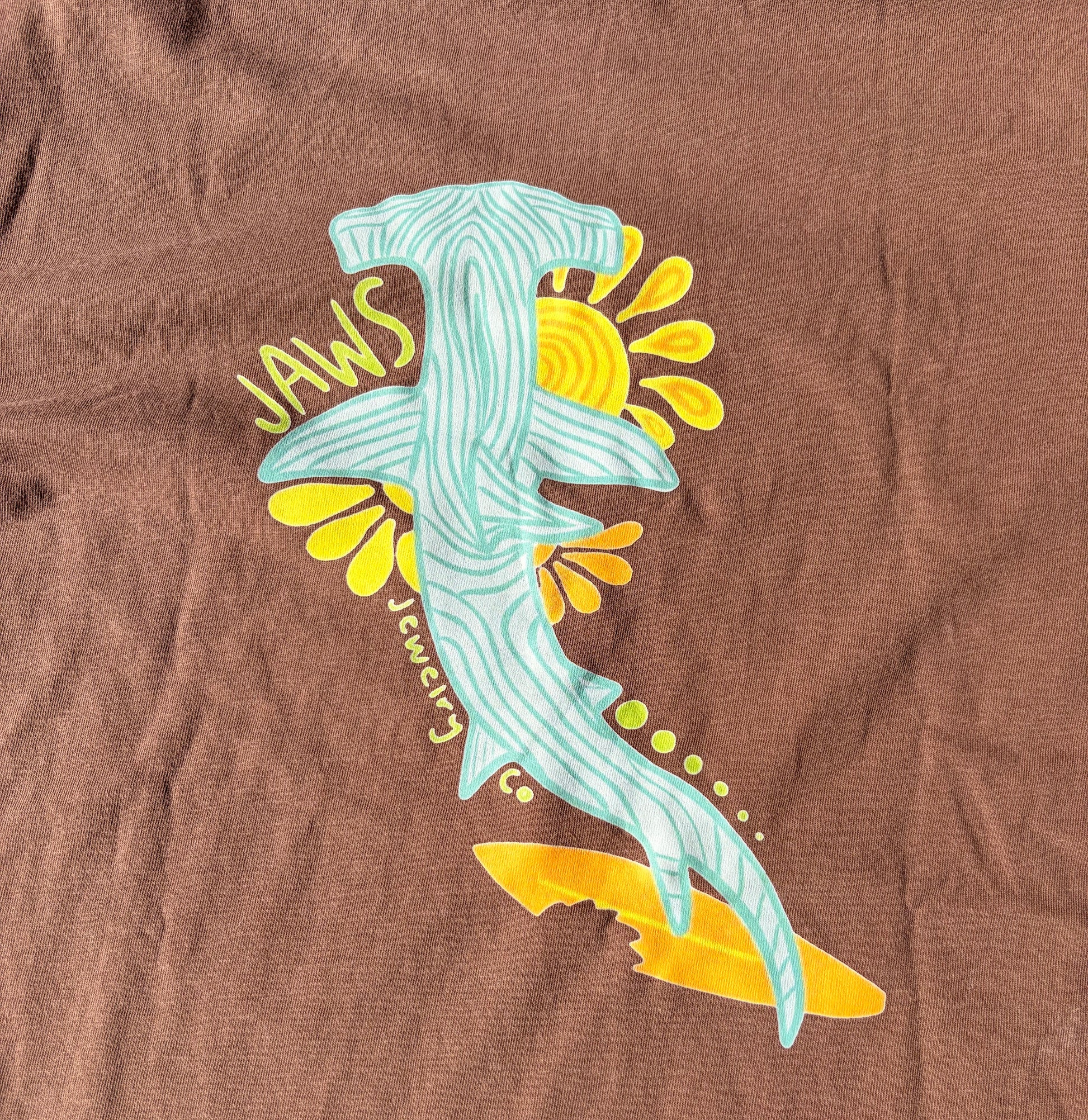 A retro surf-style tee featuring our hand-drawn hammerhead shark swimming through a sunset horizon. Printed on a chocolate Comfort Colors shirt with a mini front JAWS surfboard logo — complete with a shark bite — and a bold back graphic. Soft, heavyweight, and perfectly lived-in for beach days and shark tooth hunts.